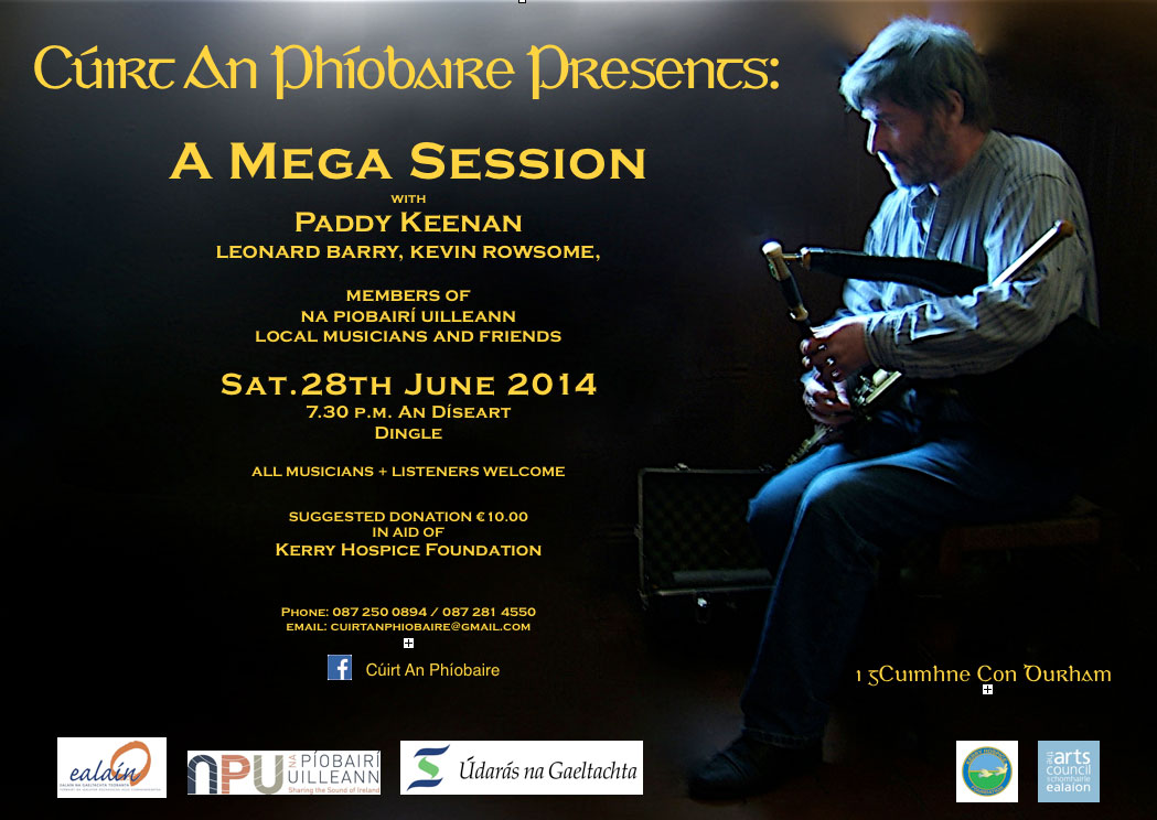06/30/14: Cúirt An Phíobaire Presents a MEGA SESSION. Saturday, 28 June 2014, 7.30 p.m. An Díseart, Dingle, Co. Kerry, Ireland. Featuring Paddy Keenan, Leonard barry, Kevin Rowsome and members of Na Piobairí Uilleann also local musicians and friends flyer ::: more »