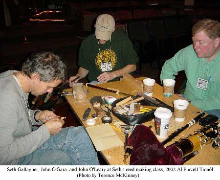 Seth Gallagher taught a concise and complete reed making class in addition to instructing and assisting other pipers with their individual problems. His presence at the Tionól was a very worthwhile experience since we all seem to experience reed problems on a much too frequent basis. John O'Gara was interested in taking Seth's class because the reed that came with his set never really played "easy" and always took way too much air to keep it going. Arriving with many of his own tools and materials in hand they dove right in. Seth looked at some reeds John had produced before and made some observations regarding blade thickness, etc. and what was right and wrong with them. "What I really wanted to learn was 'the scrape', which I clearly did not have down pat." Seth covered everything from sanding to final scraping and, of course, all along imparted wisdom on everything from the diameter of the sanding cylinder (2.6") to the length of the "vee." In short order he had fashioned a reed which played very nicely and left John walking away with a significant amount of notes. The class not being strictly limited to reeds, he also discovered through working with Seth that he needed to do a better job sealing bag and bellows from leaks. Thanks to working with Seth, John's 5 previously unsuccessful attempts at making reeds were reversed later on at home where he put his refined skills to work and was able to make a couple of reeds that played acceptably in both octaves. "All in all a great experience," he said when it was all over. "Three hours of reed making with a master!"