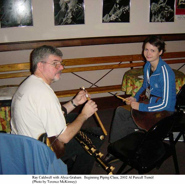 The beginning pipers experienced a special treat. Being that there were only two of them taking opposite half-day sessions, they each ended up receiving a lengthy private lesson from master Toronto piper Ray Caldwell. Being a novice musician in the presence of someone who is accomplished can often be an intimidating experience but Ray was extremely patient and made his students feel entirely comfortable. He began by launching directly into some new tunes, Tom Busby's and O'Keefe's Slide. "Ray had the patience of a saint as I struggled through the tunes," said John O'Gara, "and made some great suggestions regarding learning...mainly SLOW DOWN, get the tune down first with clear notes, then later go for speed." Going beyond expectations, Ray later emailed his students MP3 audio files of the tunes they worked on, played both slowly and up to speed. John, being thoroughly satisfied with the event, said that he would definitely attend next year's workshop.