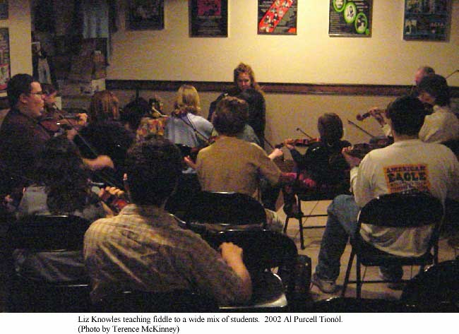 The fiddle workshop taught by Liz Knowles, offered for the first time this year, doubled the size of the Tionól. Liz was amazing in the way she took the entire group of 12 fiddlers ranging from beginning to advanced and connected with all levels simultaneously. Working with students aging from six to sixty with a wide variety of technical abilities and styles she did a tremendous job of keeping everyone's interest and addressing everyone at their own level. She began by asking her class what they wanted to accomplish and what they were looking for in the workshop. One of her extremely effective teaching methods was to get the entire class to focus by having them close their eyes and listen closely while she demonstrated a particular technique, then having them all immediately mimic what she just played. Liz's attitude toward the class was that their playing wasn't necessarily wrong but just needed to be improved and developed more. Using pieces they had already been working on, she suggested ways to enhance these tunes with different interpretations and ornamentations. She also worked with them on a couple of new tunes, Ships are Sailing (reel) and Gallagher's Jig, critiqued their techniques, and discussed individual problems they were having. After the workshop was over I heard nothing but praise for her from all grades of students along with a strong desire for her to return soon to give them more. Mary Jo Sandberg said the workshop was a wonderful experience and that her 7 year old daughter who attended with her was now excited to participate in even more of them.
