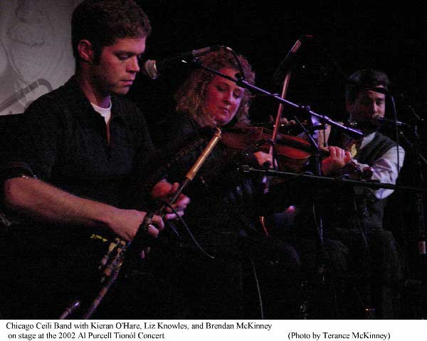 The crowd was not disappointed, however, as the second half of the concert was begun by the headliners of the night: The Chicago Ceili Band, consisting of Kieran O'Hare, Liz Knowles, and Brendan McKinney. Kieran began the set alone on the uilleann pipes and treated the crowd to a combination of tunes and stories, including a humorous tale about Al's shoes. Kieran was then joined onstage by Liz on fiddle and Brendan on flute and the trio went on to keep the feet tapping and lips laughing. Brendan amused and amazed the audience with his exuberant footwork during his flute solo and his total immersion into the aura of the music he was creating. As the night came to an end, a fitting testament to Al Purcell, the man who impacted so many lives, was complete… until next year.