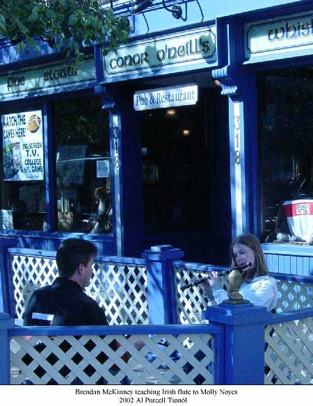 Brendan McKinney made the most of the beautiful autumn day and, true to Ann Arbor style, took his one Irish flute student, Molly Noyes, outside to Conor O'Neill's sidewalk café area where he give her a day long private lesson, teaching ornamentation, various techniques, and giving her advice on her playing and execution of the tunes they worked on. He also taught her about traditional Irish music and different styles of flute playing. Molly commented that the workshop gave her the rare opportunity to focus entirely on her instrument and music for a full day and was surprised at how much she learned from the workshop. She also remarked that Brendan is very good teacher and that much of what he taught her that day was applicable not only to traditional Irish music but to all aspects of her playing.